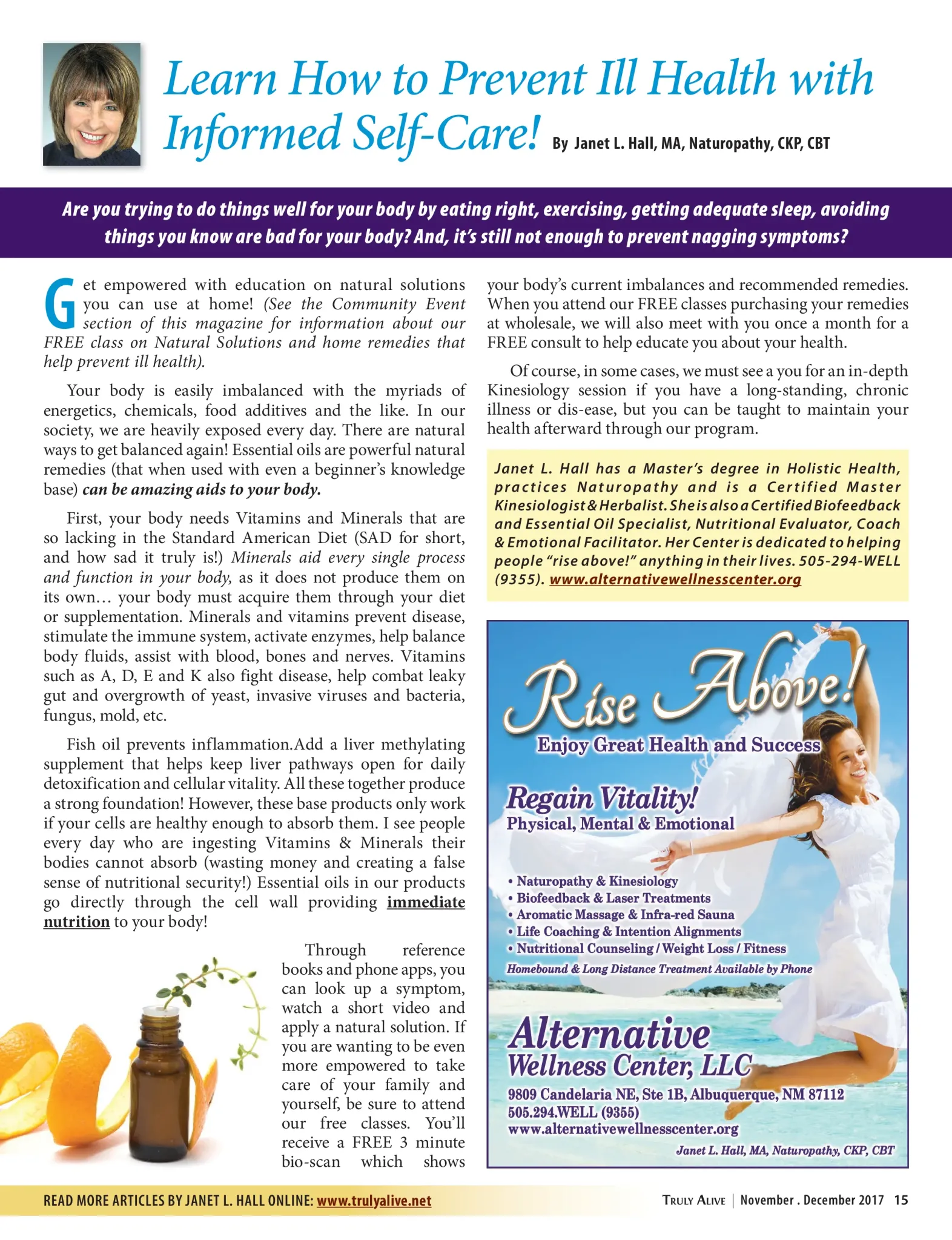 Get empowered with education on natural solutions you can use at home! (See the Community Event section of this magazine for information about our FREE class on Natural Solutions and home remedies that help prevent ill health).