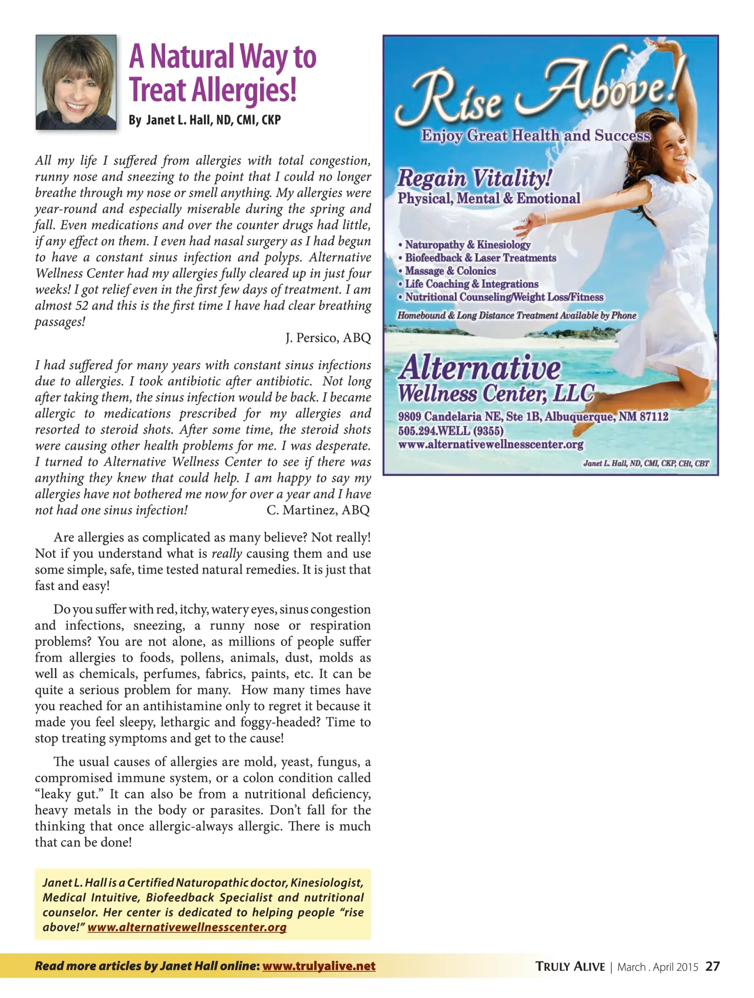 All my life I suffered from allergies with total congestion, runny nose and sneezing to the point that I could no longer breathe through my nose or smell anything. My allergies were year-round and especially miserable during the spring and fall. Even medications and over the counter drugs had little, if any effect on them. I even had nasal surgery as I had begun to have a constant sinus infection and polyps. Alternative Wellness Center had my allergies fully cleared up in just four weeks! I got relief even in the first few days of treatment. I am almost 52 and this is the first time I have had clear breathing passages!